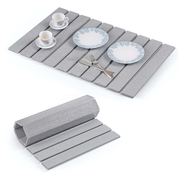 - [COLLAPSIBLE DESIGN]: The size of the dishes drying mat is 23 "x 16". After folding, the length is reduced to 4 ", can be easily placed in most kitchen drawers or cabinets. No more cluttered countertops - with this collapsible and space saving design, keep your kitchen tidy and organized.
