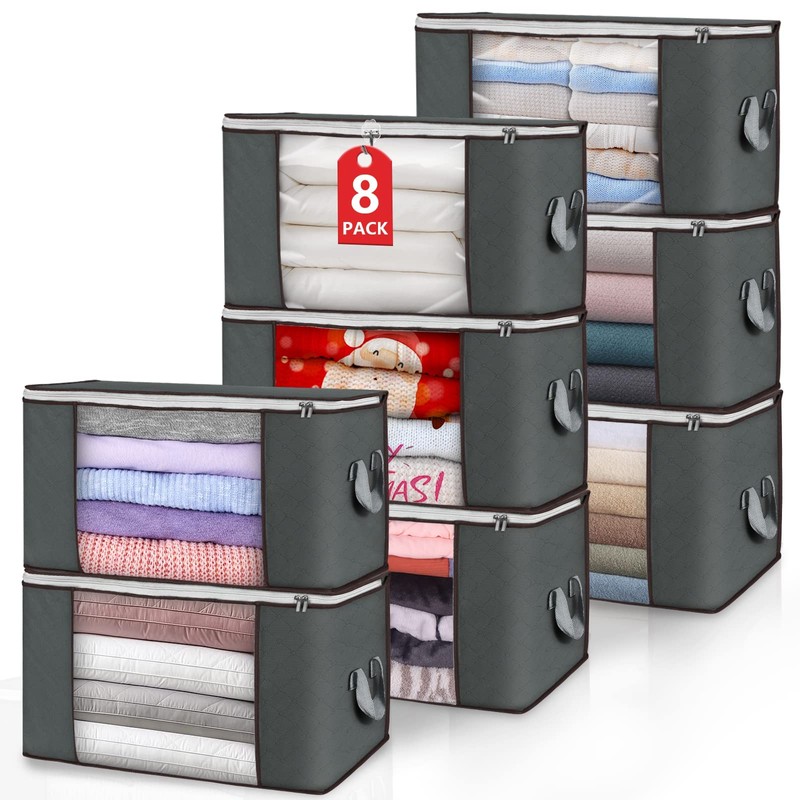 Large Storage Bags, 8 Pack Clothes Storage Bins Foldable Closet Organizers Storage Containers with Durable Handles Thick Fabric for Blanket Comforter Clothing Bedding 90L (Gray)