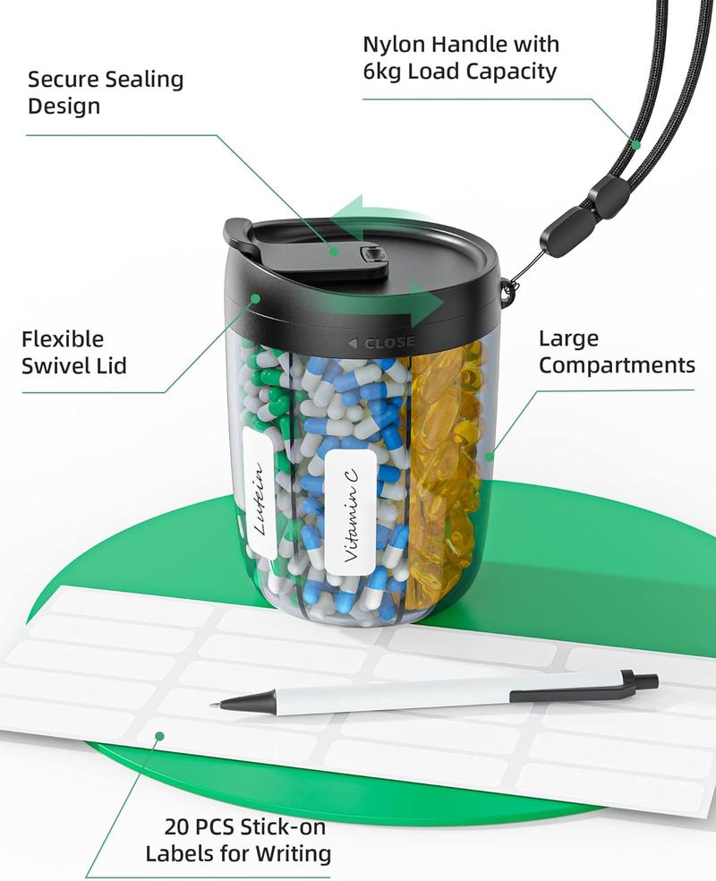 Travel hassle-free: If you are finding a pill container for long trips, PULIV travel medication organizer is your ideal travel assistant. The supplement organizer bottle is equipped with a nylon strap handle for a 6kg load, making it easy to carry around with you on the go. Enjoy your relaxing and free travel.
