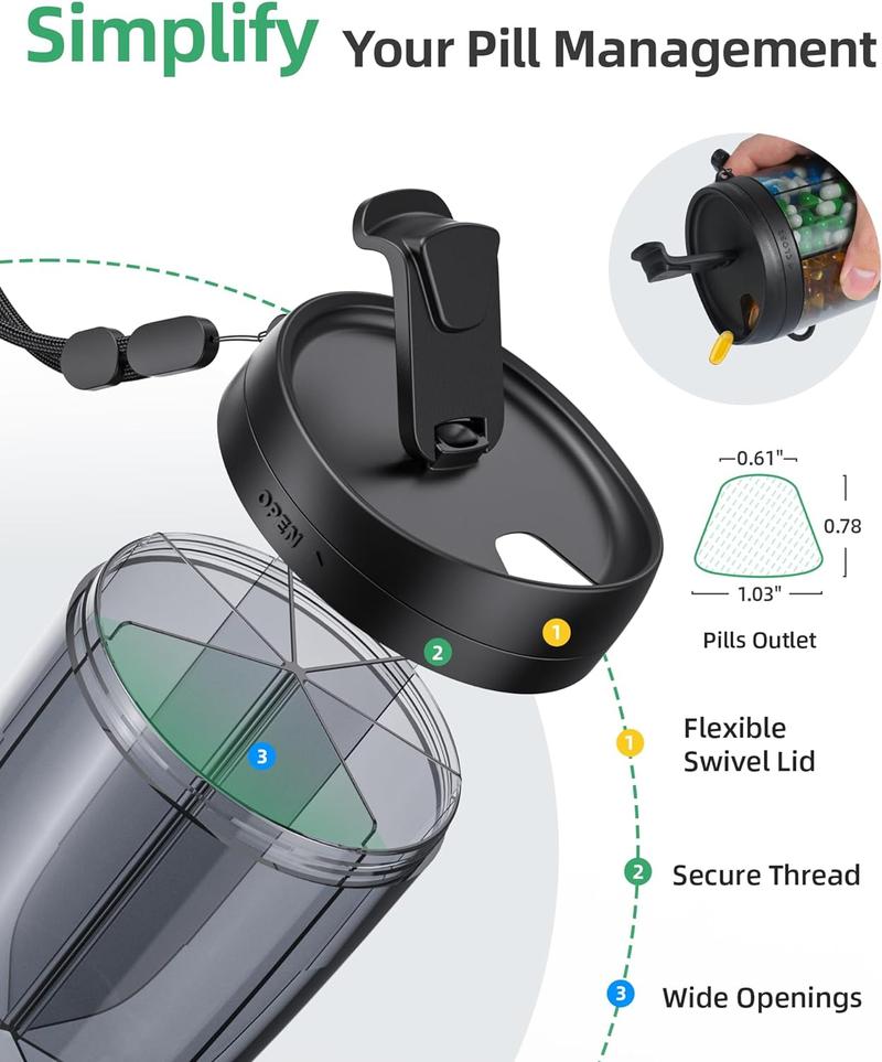 Easy to Retrieve: The smooth-loosing thread and lid can swivel flexibly, and the wide openings are friendly for taking pills. With above 3 thoughtful and unique designs, the large pill organizer makes filling and taking medication effortlessly.