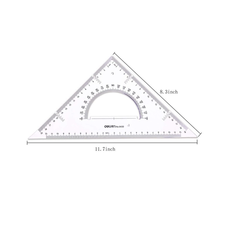 - 2 Pieces of large clear triangle rulers:One of the right-angle sides of the 45/90-degree ruler is 8.3 inches, and the beveled edge side is 11.7 inches;the 30-60 degree ruler has a longer beveled edge side of 13.5 inches long and the shorter right-angle side is 6.8 inches long