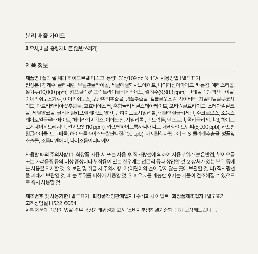 [Large Volume Composition] Vegan Puli Rice Cera Hydrogel Mask 4 Pieces*6 (Total 24 Sheets) / [대용량구성] 비건 풀리 쌀 세라 하이드로겔 마스크 4개입*6 (총 24매입)