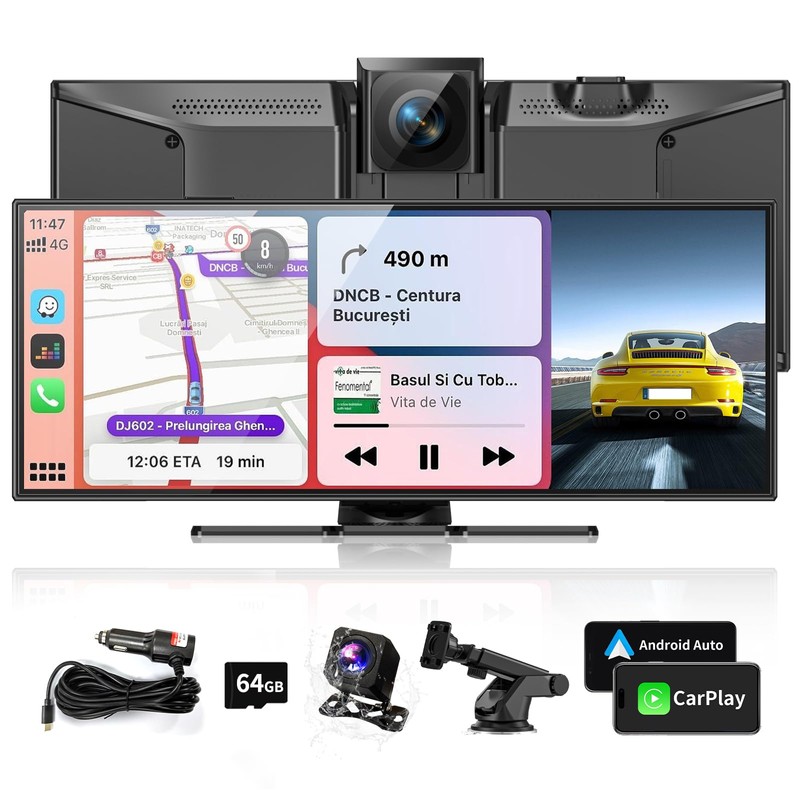 - 【4K Front & 1080P Rear View Camera】This gps navigator for car is quipped with 4K HD front camera and a 1080P rear camera, it delivers detailed and clear dual screen recording. The wireless carplay screen also has a split screen function. When reversing, it can provide you with an accurate image of the vehicle entering the parking lot, and display both front and rear views on the portable carplay screen, making reverse parking safer and more effective.