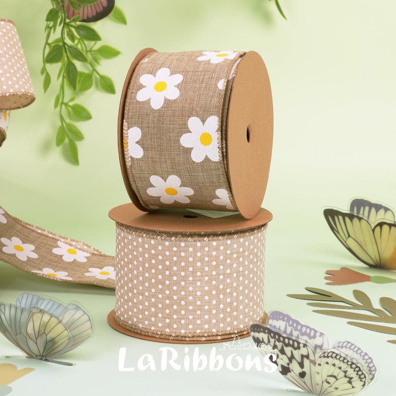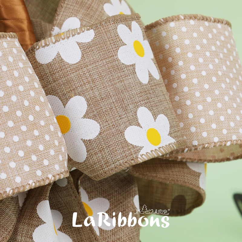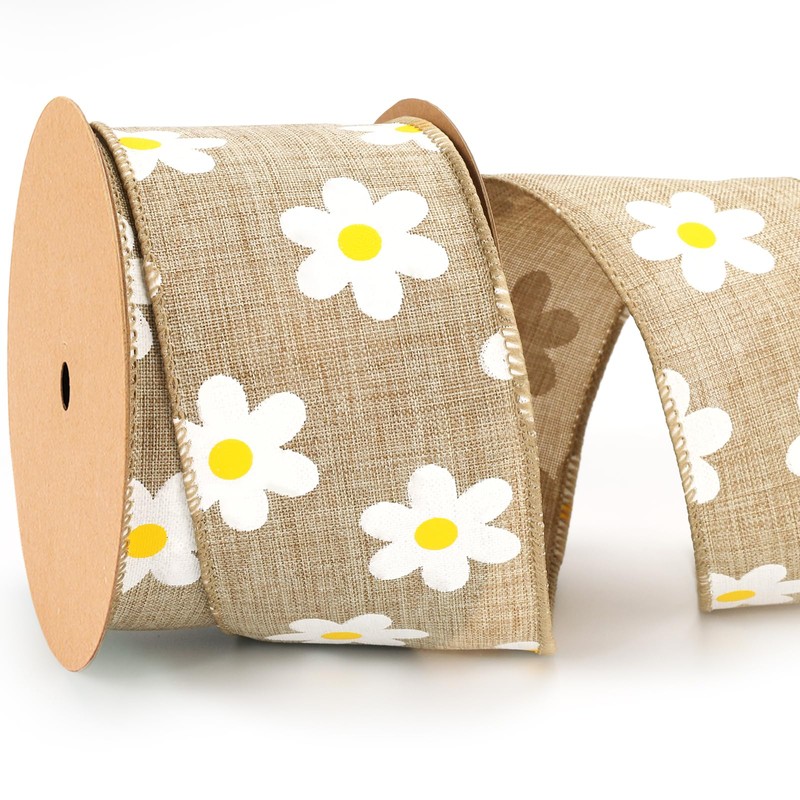 LaRibbons Daisy Wired Edge Ribbon 2.5 Inch x 12 Yards, Khaki Floral Spring Summer Ribbon for Crafts Wrapping Wreath Bow DIY Decorative