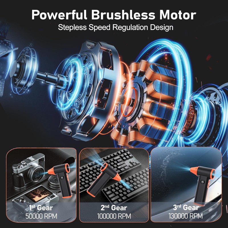 - Powerful Electric Air Duster : This mini blower is equipped with powerful brushless motor, with a speed of up to 130,000RPM, effortless cleaning with electric air duster. Adopts the technology of stepless speed regulation that can adjust the speed more accurately according to actual needs and provide a smoother operating experience, small blower can handle most jobs. Note: Please keep the air outlet away from your hair and skin to avoid inhalation