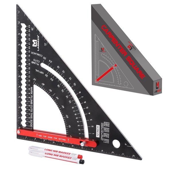 - 👍[Easy to Use] The framing square not only can you measure the angle, but you can also fix the angle you need. Its innovative angle-positioned movable rod design can position the angle you need more accurately and convenient. Adjust the red angle rod to adjust the desired angle, and tighten the nut to achieve accurate positioning. Woodworking square is a tool that can be repeatedly cut. The carpenter square is equipped with an angle conversion table and is convenient to use.
