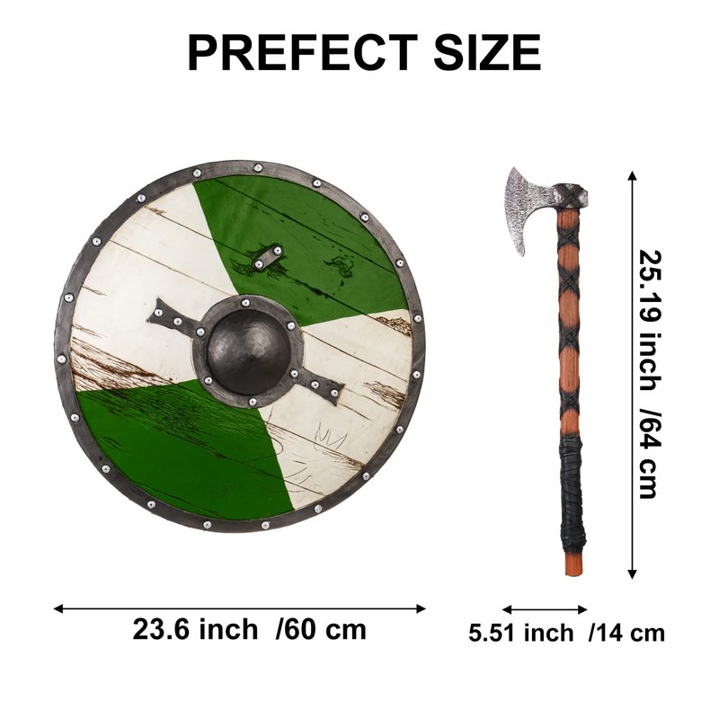- 【Size】Viking shield: 23.6(D)*4(H) inches. The size of this shield is good for adults. The weight is about 1.7kg. Viking axe:25.2(L)*5.5(W)*1.2(H) inches, the weight is about 0.35kg. So, that will make it easier to match your outfit.
