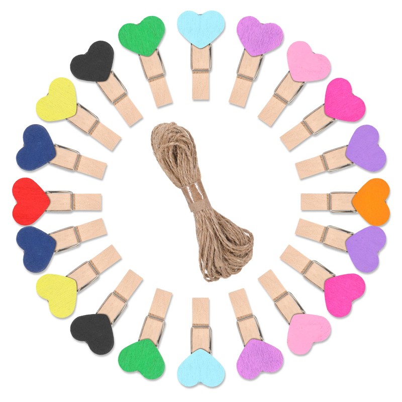 Produktname: 50 Stück Holzklammern Klein, Mini Herzklammern mit 10m Juteschnur Bunte Kleine Wäscheklammern Fotohalter