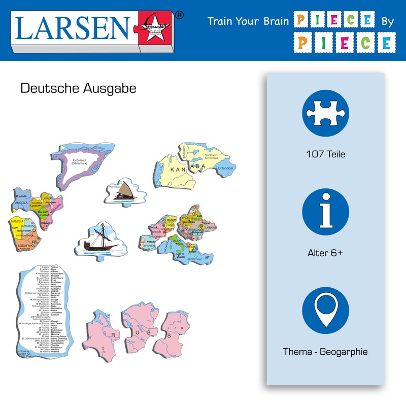 Larsen K1 The Earth Political World Map, German Edition, Frame Puzzle with 107 Pieces