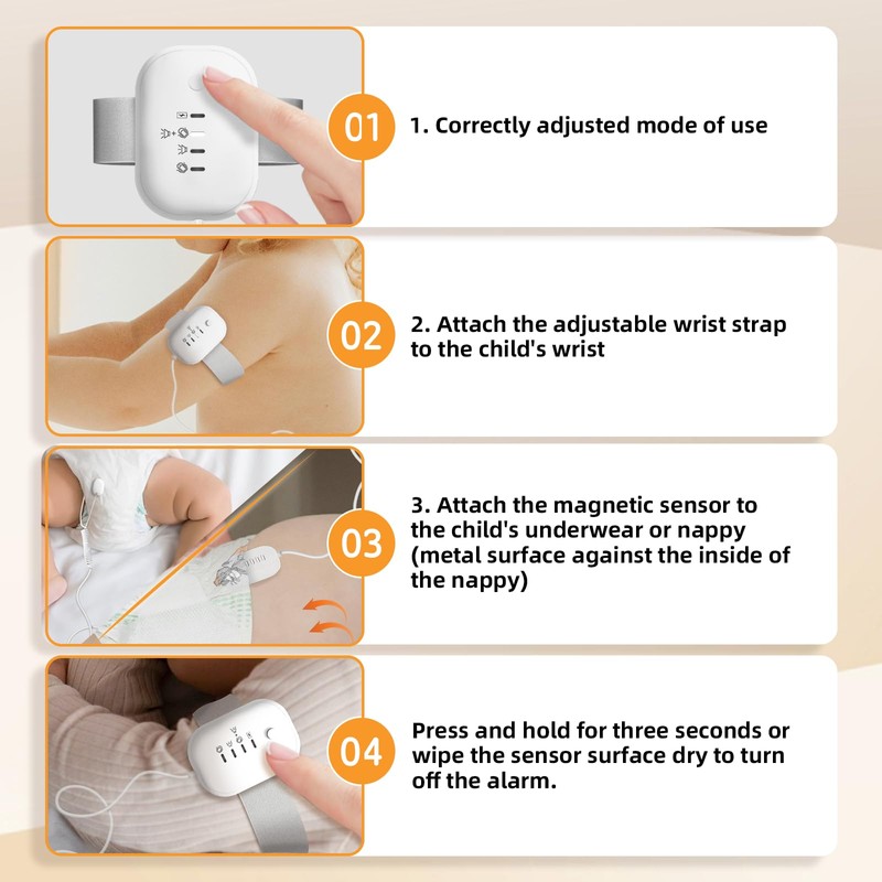 - Potty Training Alarm: Reliable sensors detect the first drop of urine and the alarm clock immediately wakes the child up with vibrations and beeps, helping them to improve their bedwetting problem. Tips: To stop the device, press and hold the switch button for 3 seconds or dry the sensor's metal surface.
