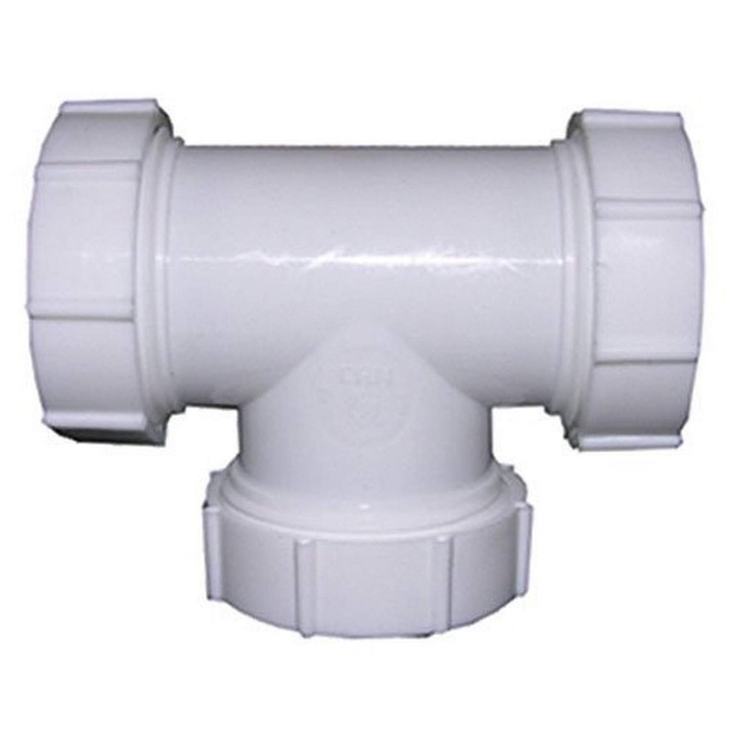 LASCO 03-4277 White Plastic Tubular, 1-1/2-Inch Slip Joint Tee, With Nuts And Washers. White plastic construction. 1-1/4-Inch or 1-1/2-Inch outside diameter. Commonly used with kitchen, laundry, or bathroom sinks. Slip joint connection assembly, includes 3 nuts and washers each for complete installation. For use as a lavatory/kitchen drain tree connection, tube all 3 ends.