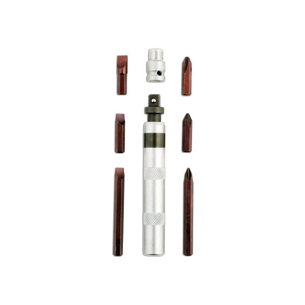 - Set includes: Micro impact driver, 3/8"D x 5/16" adaptor & six bits.