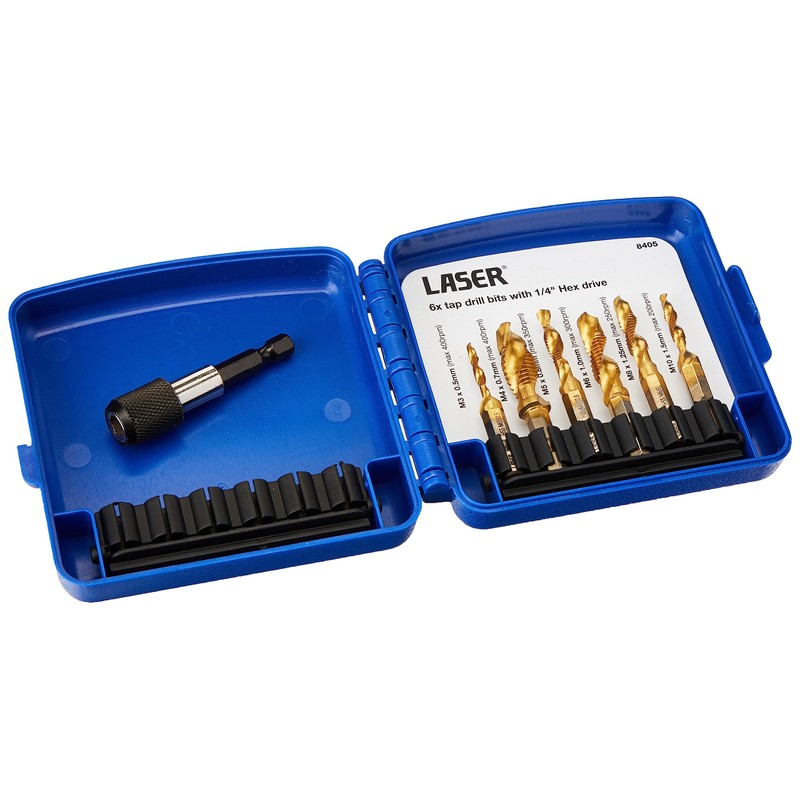 - 6x tap drill bits with 1/4" Hex drive: M3 x 0.5 (max 400rpm), M4 x 0.7 (max 400rpm), M5 x 0.8 (max 350rpm), M6 x 1.0 (max 300rpm), M8 x 1.25 (max 250rpm) and M10 x 1.5mm (max 200rpm). NOTE: The max rpm is a guide for use on wood and plastic only.