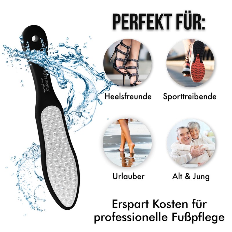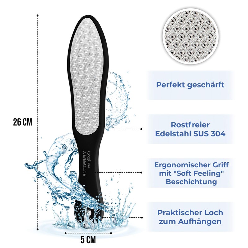 - ► Innovation: The stainless rasp surfaces are manufactured using laser technology. This makes the callus rasp particularly sharp, durable and efficient. The robust and ergonomic design of the laser rasp is not only an eye-catcher, but offers the best comfort in use.