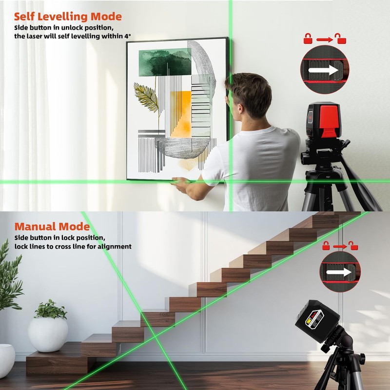 - 【Dual Modes & Self-Leveling Functionality】The Bio-th laser level features two operating modes: self leveling laser level and manual mode. In self-leveling mode, it automatically adjusts within ±4° to project precise horizontal, vertical, or cross lines. If the angle exceeds the range, the laser will flash to indicate it is out of level. Manual mode allows the laser to be locked at any angle, ideal for creative or sloped installations.