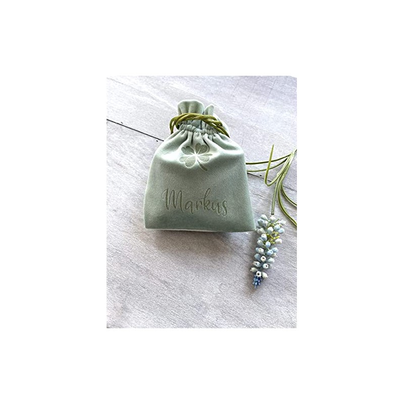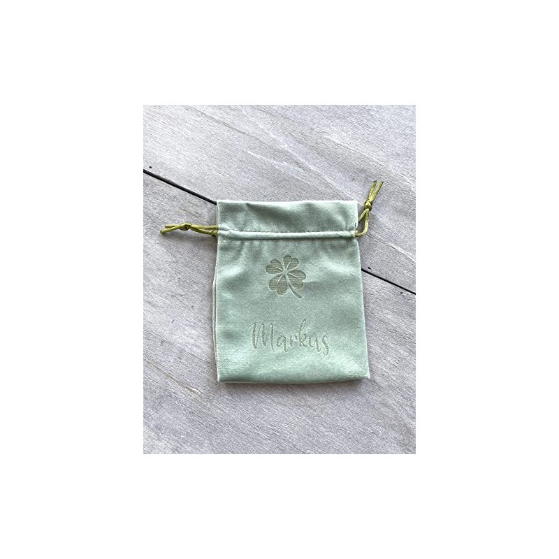 Samtbeutel mit Namen. Eine wunderschöne Geschenkverpackung mit einem Namen oder einem Wort nach Wunsch personalisiert und einem Kleeblatt. Das Wort/der Name wird individuell lasergraviert. Die Maße sind 12 mal 15 Zentimeter.