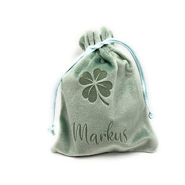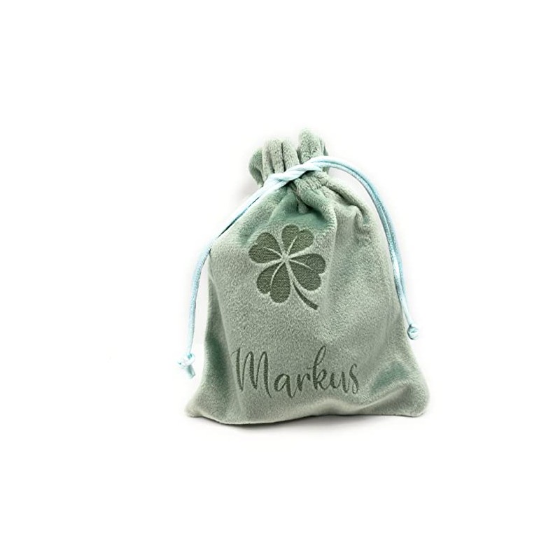 Samtbeutel mit Namen. Eine wunderschöne Geschenkverpackung mit einem Namen oder einem Wort nach Wunsch personalisiert und einem Kleeblatt. Das Wort/der Name wird individuell lasergraviert. Die Maße sind 12 mal 15 Zentimeter.