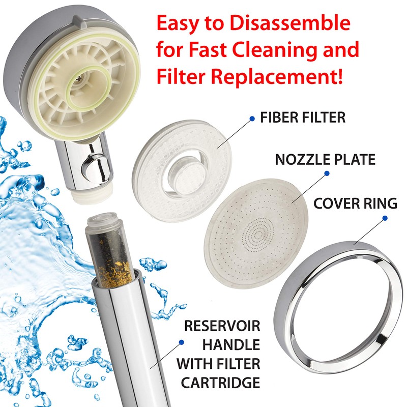 TWO BUILT-IN WATER FILTERS deliver advanced multi-stage water filtration for healthier, younger-looking skin & hair | POWERHEAD DISK FILTER purifies shower water by blocking sediments and impurities, while HANDLE FILTER CARTRIDGE (included) can be added into Handle Reservoir. It combines powerful KDF, Calcium Sulfite and Active Carbon to remove lead, chlorine, pesticides and heavy metals, prevent rust, lime and odors, soften water and improve its PH balance.