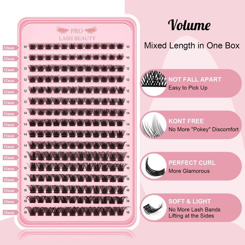 - 192 Pcs Cluster Lashes: The hottest Cluster lashes among the social media are avaiable now! Different from other brands, PRO LashBeauty can provide 192 pcs in one tray! Mix Length from 8mm to 16mm. Same Price you can get more lashes and use more times.