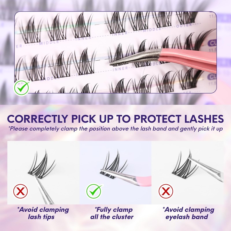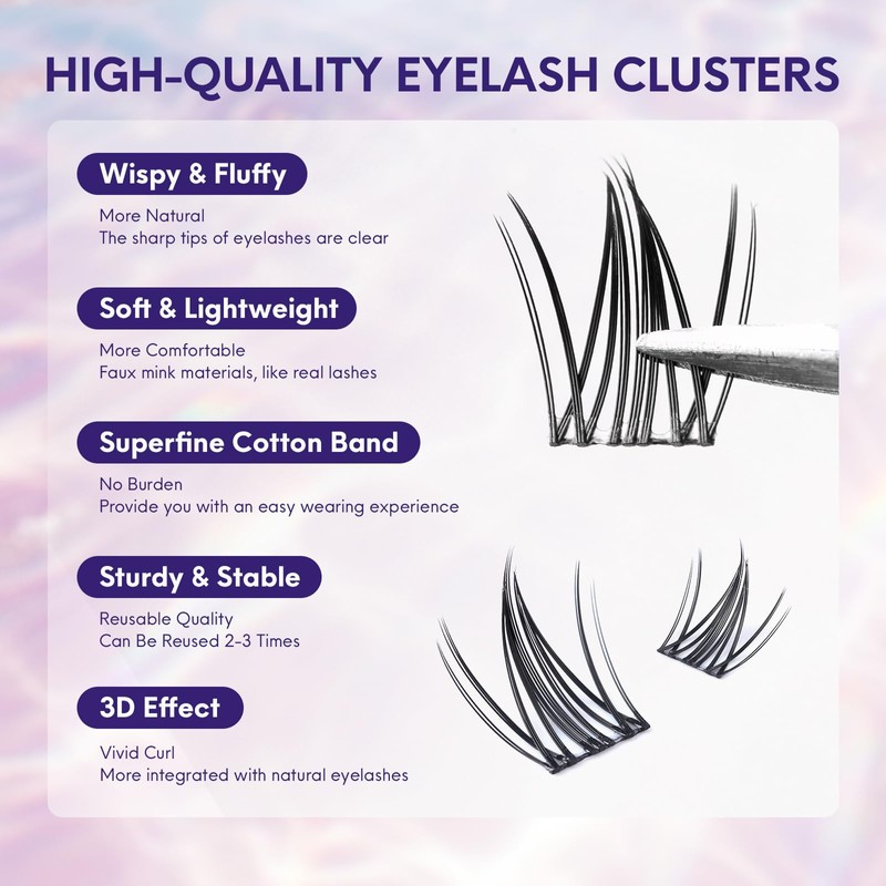 - 【High Quality & Reusable DIY Eyelash Extensions】Eyelash clusters are made of high-quality fibers, knots-free, soft, lightweight, cruelty-free. Clusters are soft and light, easy to pick up and apply, will not break down, no irritation. With proper care, each eye lash cluster wispy can be reused, providing a cost-effective way to keep your lashes looking amazing all the time.