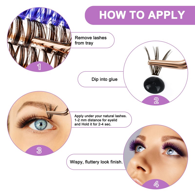 • Suitable to wear: Use a tweezer to pinch the band of cluster eyelashes and apply lash clusters below your natural lashes. You can barely feel the cluster lashes. The bottom of the clusters is flat and hardly noticeable. The lash band part will not stab your eyelid area when you blink. Bring you a perfect experience during lash application.