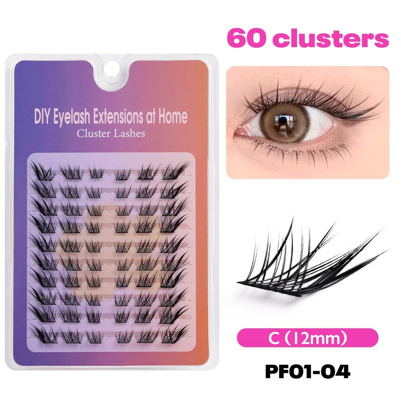 Lash Clusters DIY Cluster Eyelash Extensions Kit 60pcs Individual Lashes, No Glue Needed, Lightweight & Comfortable, Reusable False Lashes with Thin Band for Easy Self-Application at Home (PF01-04)