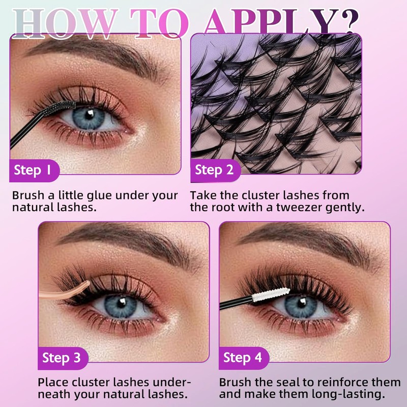 - Easy-Application Tips: Gentlely roll the lash band down with tweezers; Apply lash bond on your eyelashes; Place the lash clusters; Use lash seal brush to lock