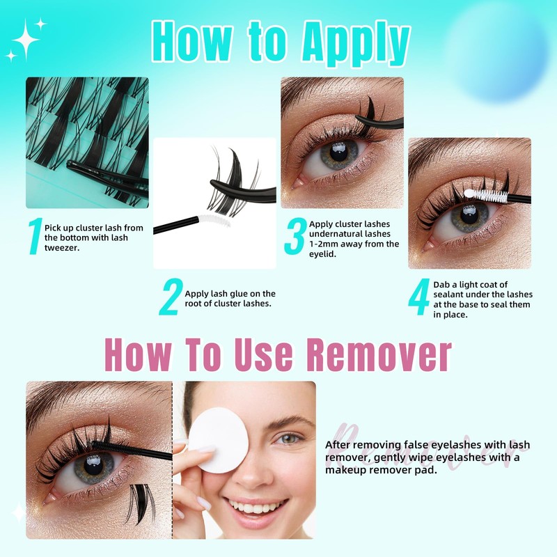 - 【Long Lasting & Soft】AMZGlRL lash glue is specially designed for DIY lash extensions at home. The unique formula gives the eyelash bond long-retention holding power. And lock the beauty by seal the cluster lashes in place. You can apply silk lash clusters in ascending order which gives a nice cat-eye effect.AMZGlRL eyelash extensions adopted the 3d faux mink lashes material, more soft and lightweight natural eyelashes.