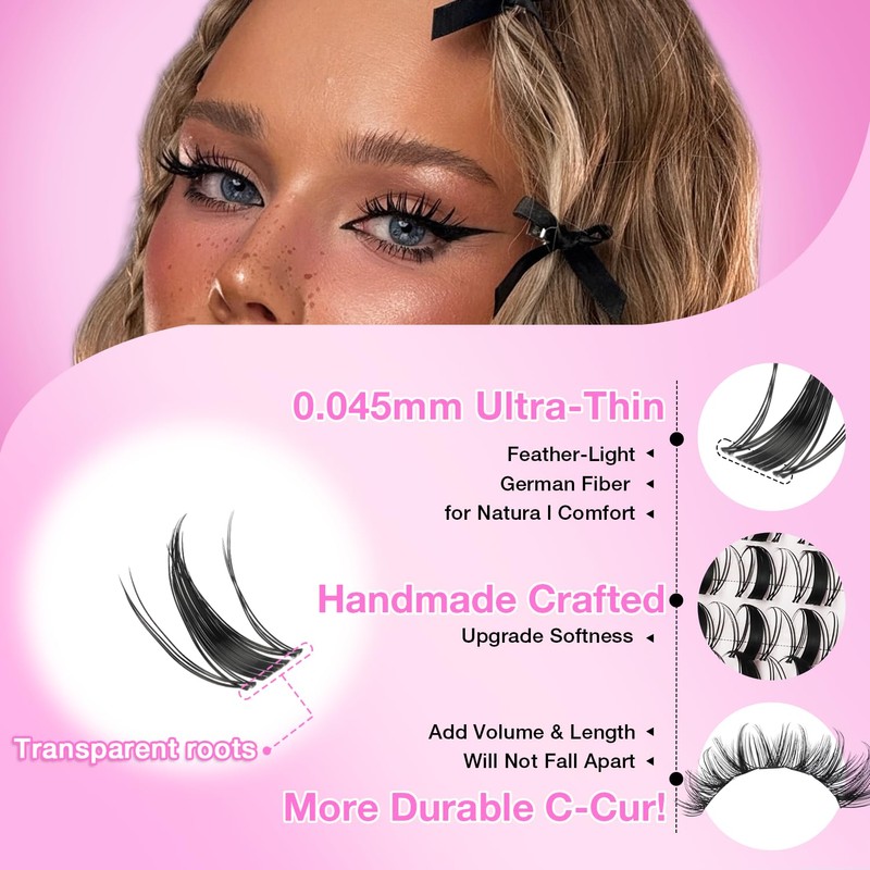 - 【Ultra-Soft & Featherlight Design】– Premium 0.045mm Ultra-Thin Black Band! Crafted with premium imported 0.045mm ultra-thin black band, our natural lash clusters are ultra-thin and weightless, mimicking real lashes. These fluffy lash clusters bend naturally, providing zero irritation even after 72 hours—perfect for daily false eyelashes or eyelash extension kit newbies!
