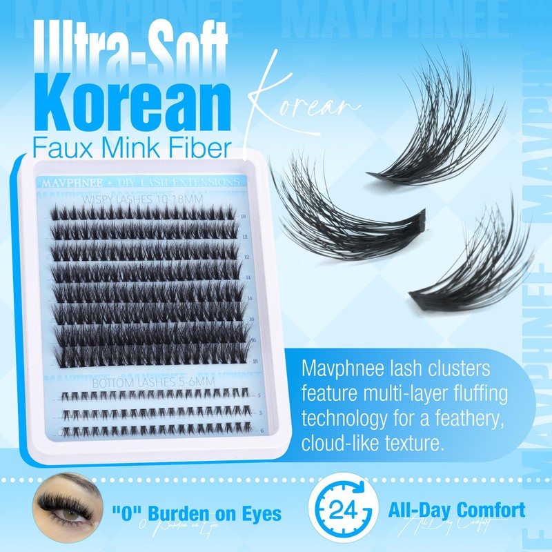 - 5D Fluff Technology: Featherweight Volume & Texture: Experience multi-dimensional lash drama with our 5D Fluff technology! Each Korean synthetic mink cluster eyelash extension features tapered wispy ends and graduated lengths that create cloud-like volume, hyper-natural feathering, and doll-eye fluffiness. The crisscross fiber alignment mimics real lashes for seamless blendability, delivering clump-free fullness, eye-opening lift, and soft diffused texture that lasts all day.