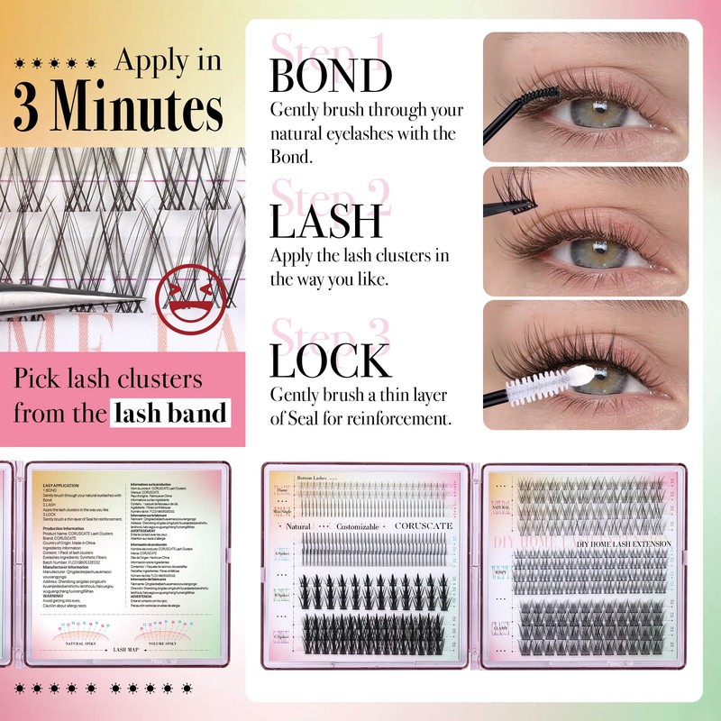 • Customizable DIY Lash Extension Experience Achieve professional-looking lash extensions in minutes with our easy-to-apply individual lash clusters kit; Perfect for both beginners and experienced users our lash clusters allow you to customize your look by mixing different styles and lengths; Create subtle everyday enhancement that perfectly complement your eye shape and personal style