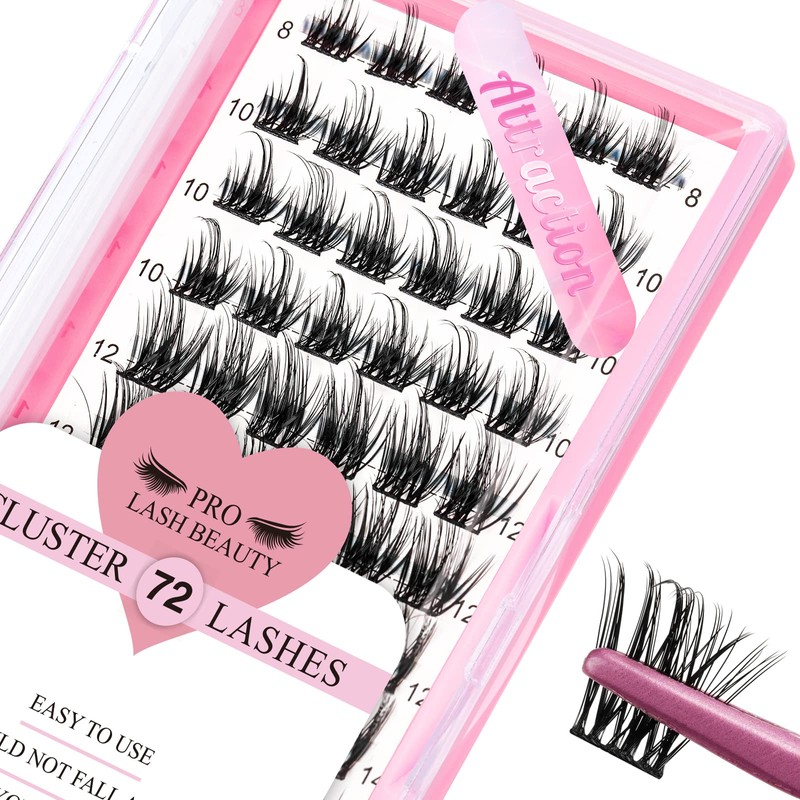 Lash Clusters, PRO,72 Pcs Individual Cluster Lashes 3D Effect DIY Lash Extension 8-16mm Eyelash Clusters Volume Wispy Lashes Super Thin Band Reusable Soft & Comfortable(Attraction,C-8-16mix)