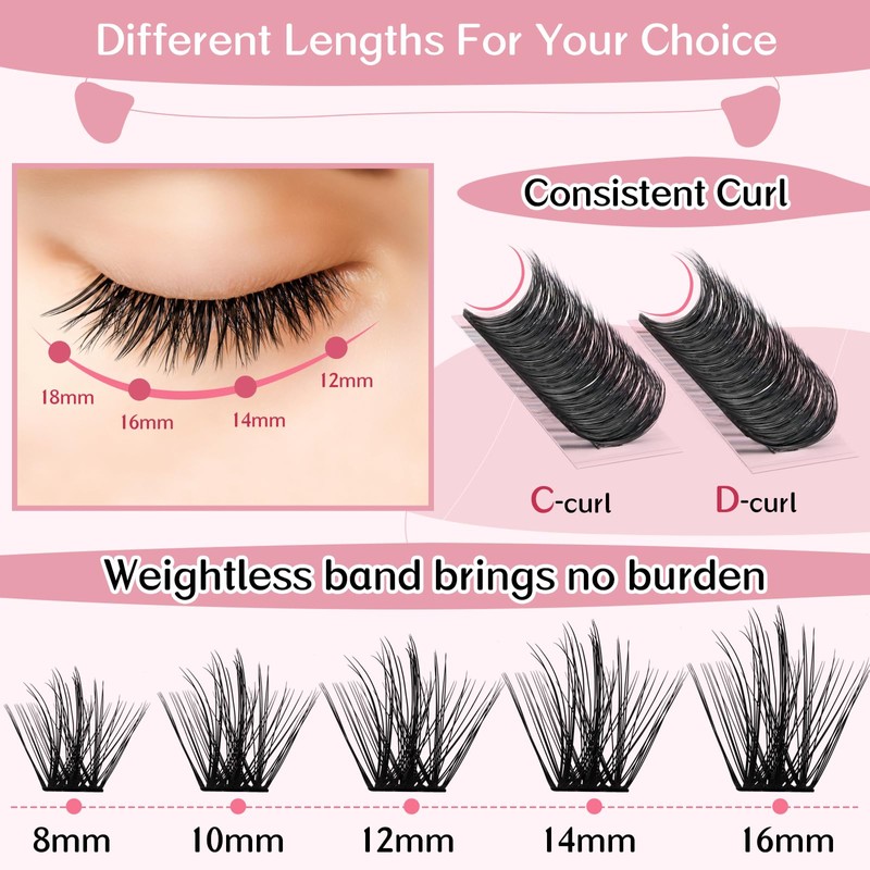 - Bring salon to your home: Pro LashBeauty Lash clusters are easy to apply. Divided individual Lashes into sections, easy to pick up and apply by yourself. You can apply the eyelashes with different lengths and styles according to different occasion. You will become a master of DIY lash extensions with a little practice!