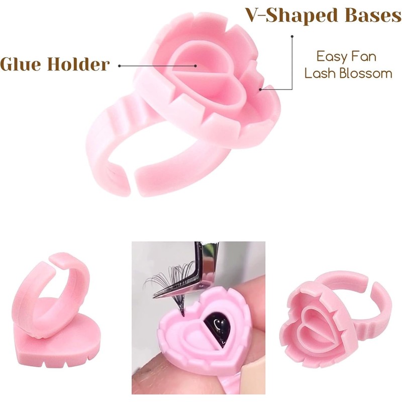- Heart Shape Lash Fan Blossom Glue Rings: There are 100 heart - shape lash fan blossom glue rings in the package. Each set comes with 10 V - breaches and 2 glue holders, and the ring diameter is adjustable.