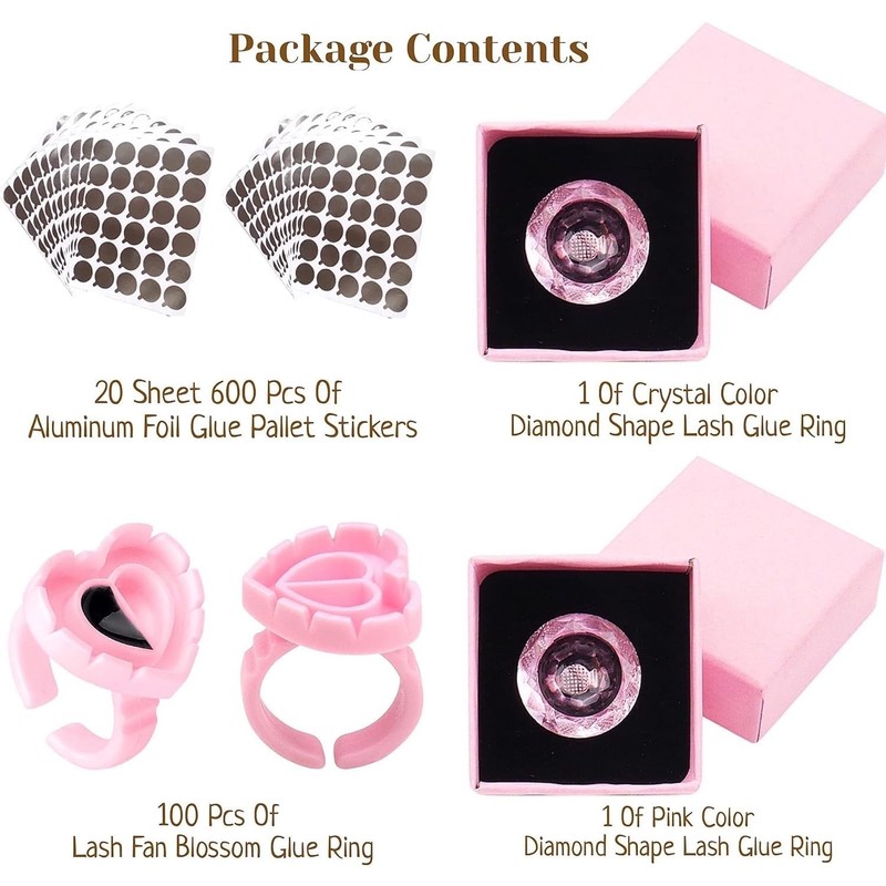 - Diamond Shape Lash Glue Rings: The package includes 1 pink and 1 crystal - colored diamond - shape lash glue ring. They have an adjustable ring diameter. It is recommended to use glue pallet stickers with them for a quick, easy, and mess - free experience.