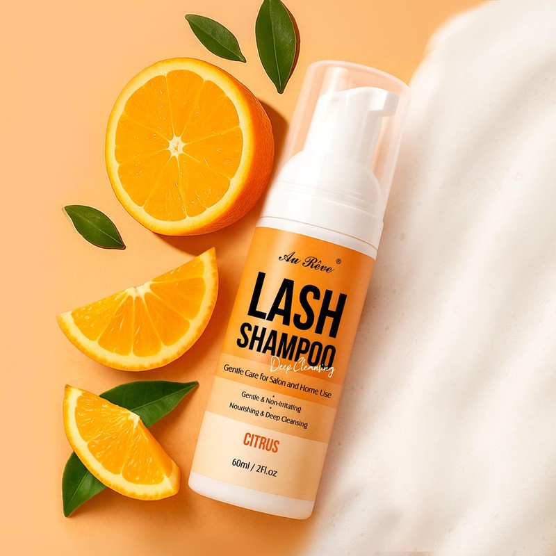 Lash Shampoo for Lash Extensions 60 Ml/2fl.oz Eyelash Extension Cleanser Oil Free Lash Cleanser for Eyelash Care, Gentle Foaming Eyelash Shampoo with Brush for Salon Home Care (Citrus 60ml)