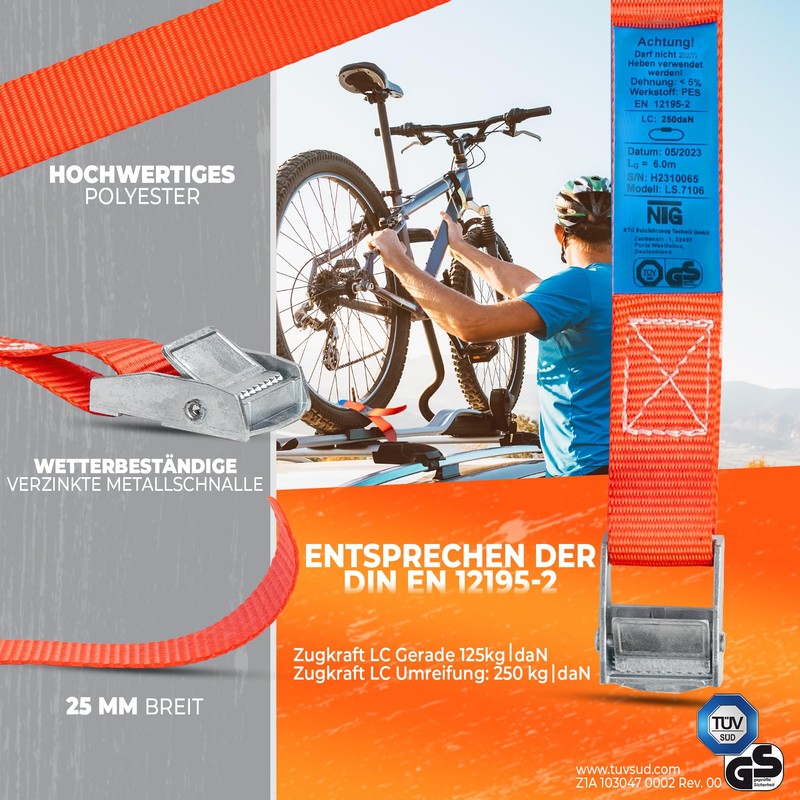 - ✔ Versatile lashing strap set: for securing loads, transport securing of e.g. bicycle, bicycle carrier, motorcycle, car, roof rack, roof box, surfboard, caravan and many more