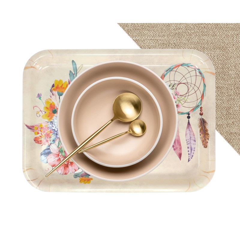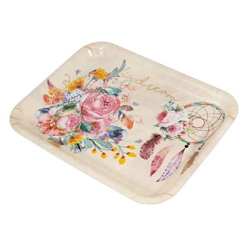 The melamine tray is both visually appealing and functional. The delicate motif of this small serving tray of a dream catcher, surrounded by pink roses and smaller yellow, orange and purple flowers, creates a romantic and dreamy atmosphere on your dining table. The light pink background of the coffee tray and the lettering "big dream" give the tray an enchanting touch. The slightly shiny surface of the gastro tray rounds off the elegant design.