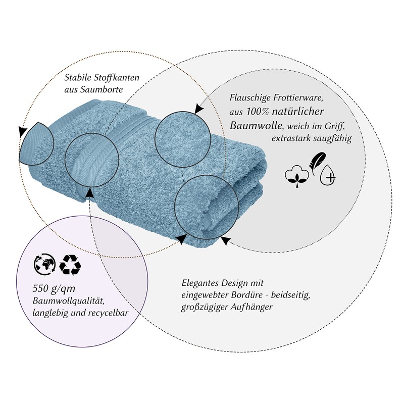- Each terry towel is made from 100% cotton, in the finest terry quality of 550 g/m². The cotton towels are washable at up to 60 °C.