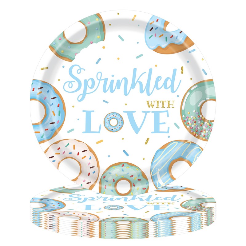 - Our donut baby sprinkle party tableware set comes equipped with 20 pieces of 9 inch plates, 20 pieces of 7 inch dessert plates, 20 napkins, 20 cups, and 20 sets of disposable cutlery; Get all the essentials for a convenient party experience in one package