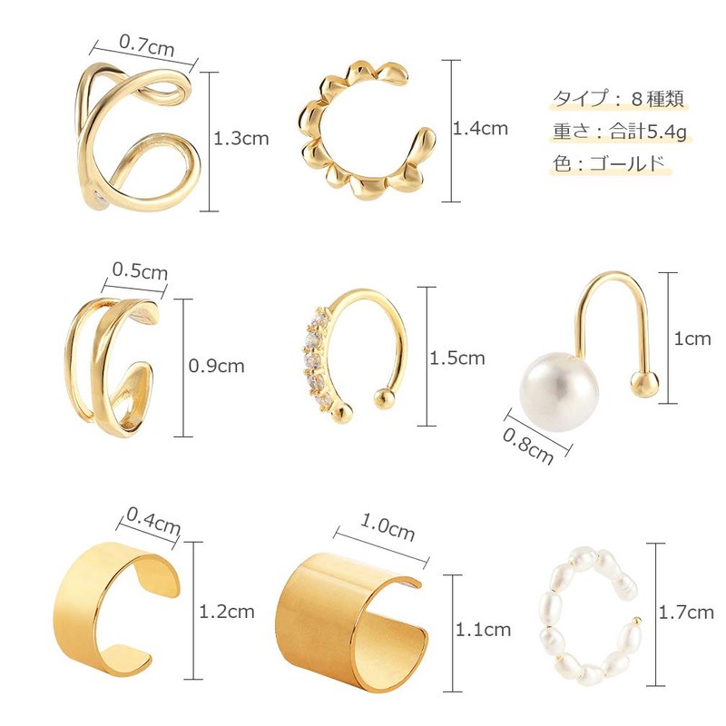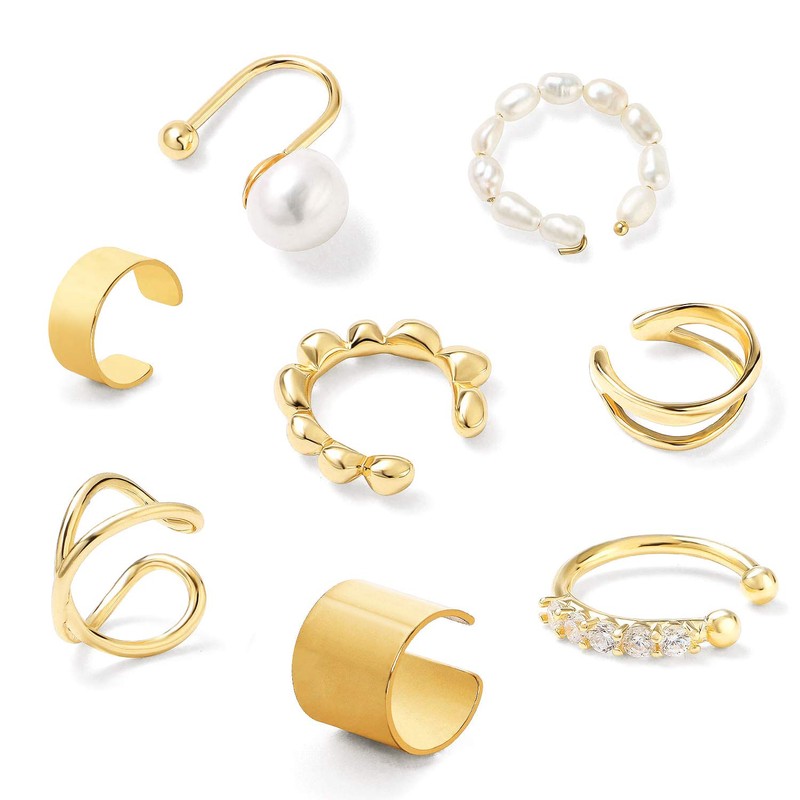 Lasoll Ear Cuffs, 8 Pieces, Fake Earrings, Non-Hole Earrings, Women's, Cartilage, Pinching, Stackable, No Piercing Required, Hypoallergenic, Stylish, Birthday, Mother's Day, Wedding, Anniversary, Alloy, Gold