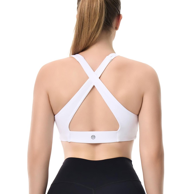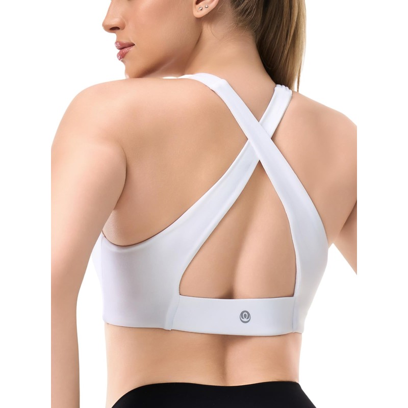 Lassosi Women's V Neck Sports Bra Wide Straps Cross Back Light Compression Padded Workout Yoga Top White M
