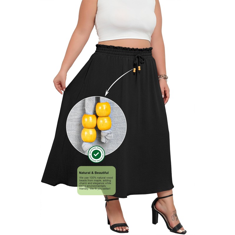 - 【Cute Design】:Women plus size, 100% natural wooden beads, adjustable drawstring, side pockets, flowy swing, boho A-line, solid&floral print, loose fit Maxi length skirt. The elastic pleated high waist guarantees freedom of movement, making it ideal for various activities. Two handy pockets integrate practicality without sacrificing style, eliminating the need to carry a purse or clutch everywhere you go.