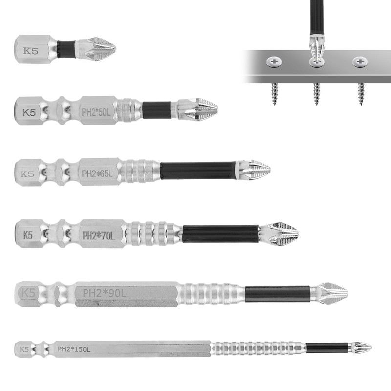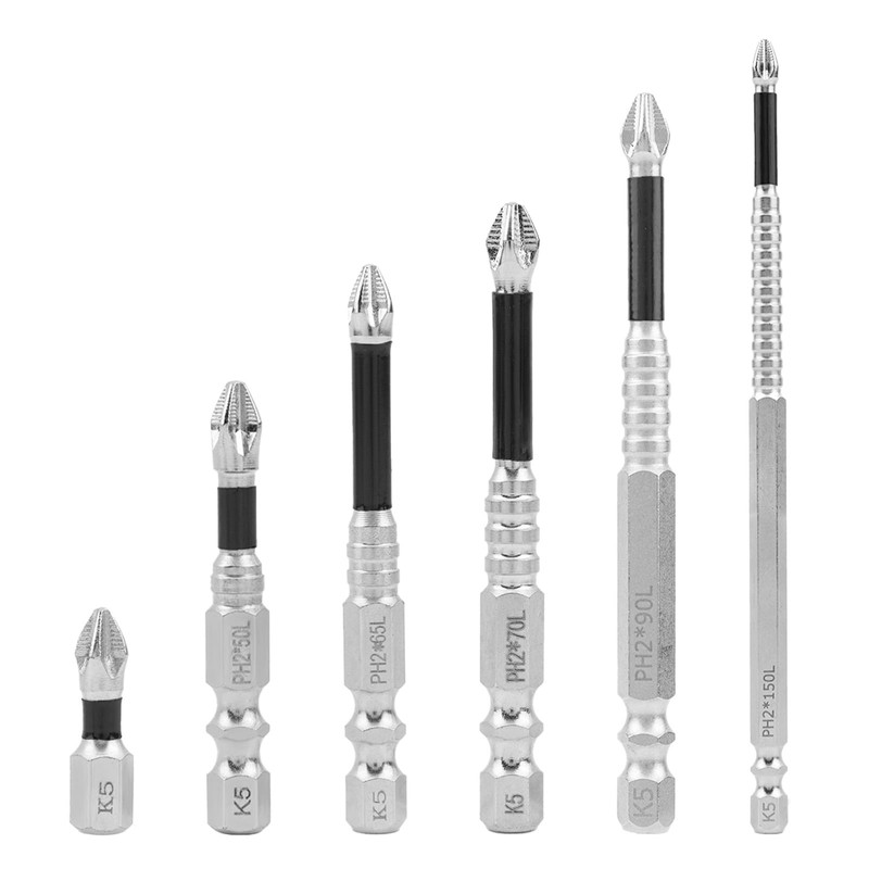 - Magnetic Bit Set: Includes 6 high magnetic screwdriver drill bits in various lengths: 25mm, 50mm, 65mm, 70mm, 90mm, 150mm, and with a uniform diameter of 0.7cm/0.28in, providing flexibility for a wide range of tasks.