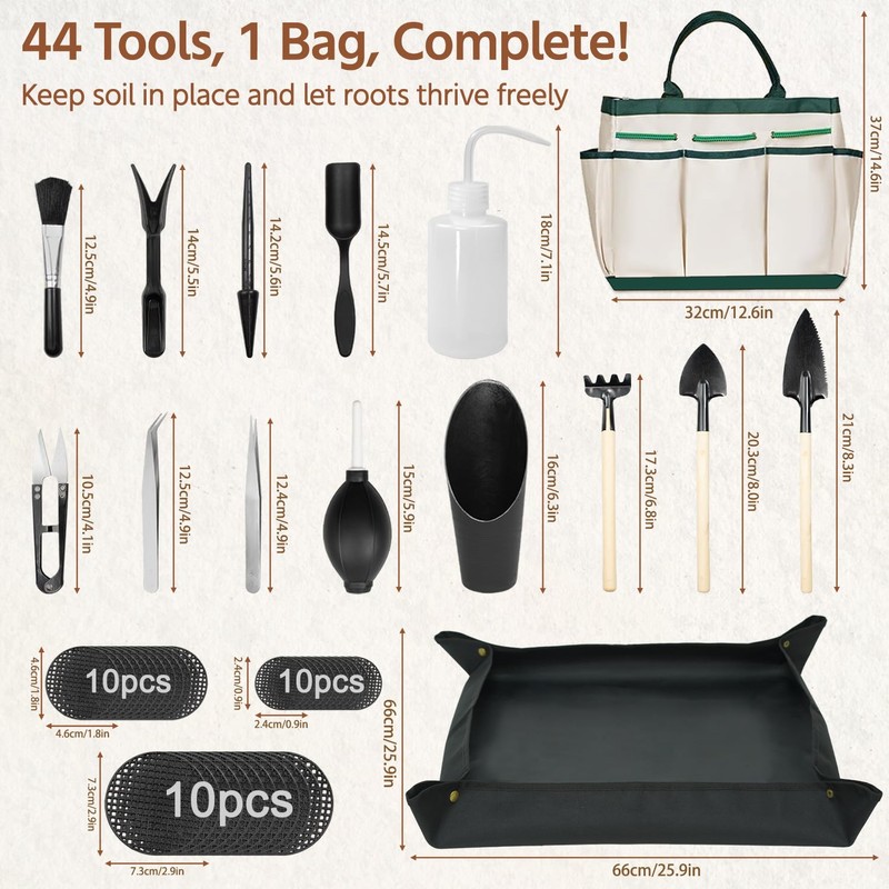 - 【45 pcs Complete Set for Easy Gardening】Having all the gardening tools you need in 1 bag! This kit includes a bag with a indoor potting mat and 43 miniature gardening tools, such as a shovel, scissors, and a watering bottle. No more searching for missing tools—everything you need is right here.