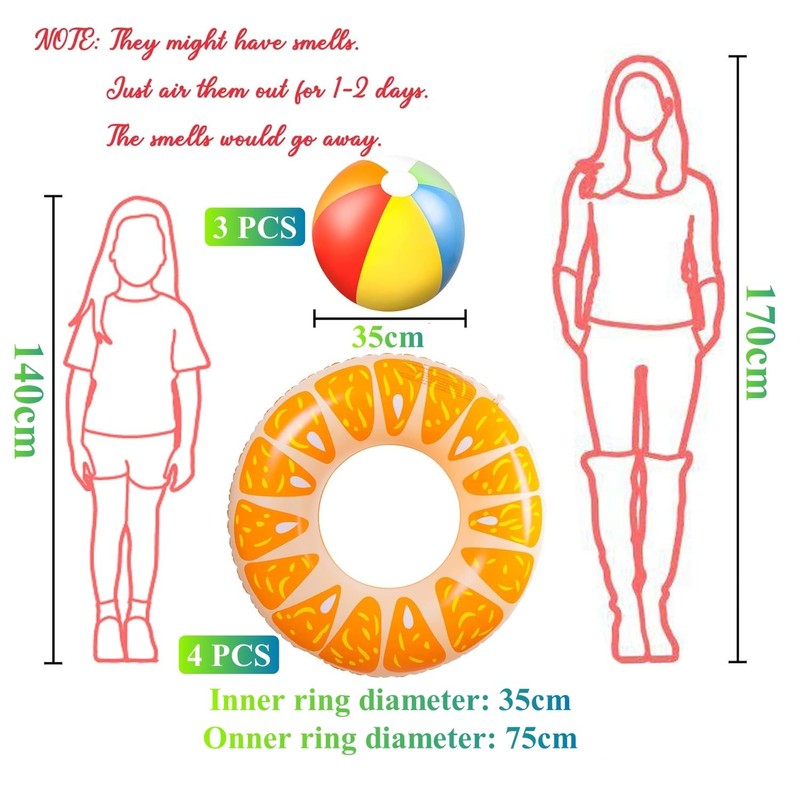 • [Size] Inner ring diameter: 35CM, outer ring diameter: 75CM, beach ball diameter: 35cm, included 4pcs swimming rings and 3pcs water balls, perfect for adults and children (They may have odor, just let them dry for 1-2 days, the smell will disappear)