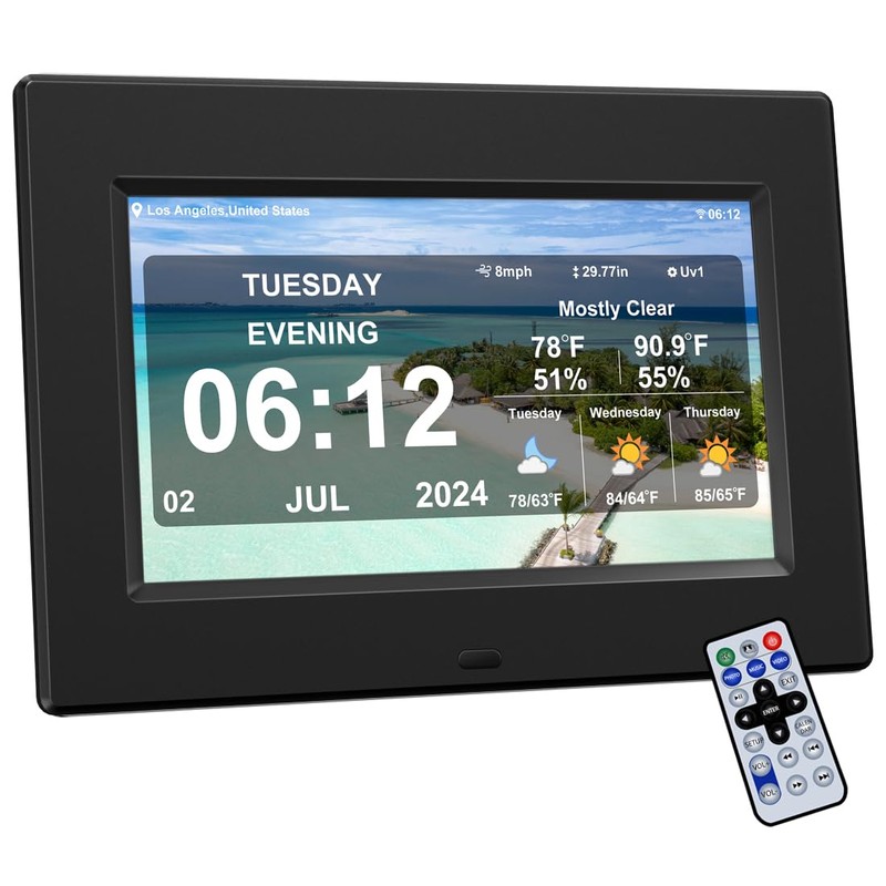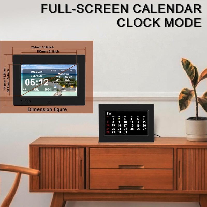 - 【As Network Weather Clock】 : collects location data from 200,000 cities and regions worldwide. After manually connecting to a wireless network, it takes 1-3 minutes to retrieve information for your selected city. The clock displays the weather forecast (for the next 3-5 days), indoor and outdoor temperature and humidity, outdoor UV intensity, and wind speed. Those information will updated every 2 hours. With a 7-inch large HD display and IPS full-view screen, you can clearly read all the information from any angle and distance indoors.