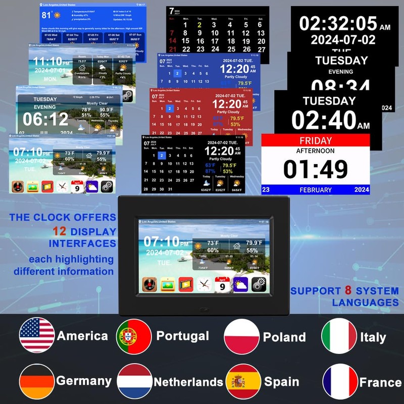 - 【2024 Newest developed, Multifunctional clock】: ①Network clock, ②Weather clock, and ③Elderly clock. It can connect to WiFi and display real-time weather forecasts, indoor and outdoor temperature and humidity, and a perpetual calendar. It features an extra-large font to display the time, date, and day of the week. built-in 8 alarm sets and announces the time hourly with voice prompts. has 8 OS languages
