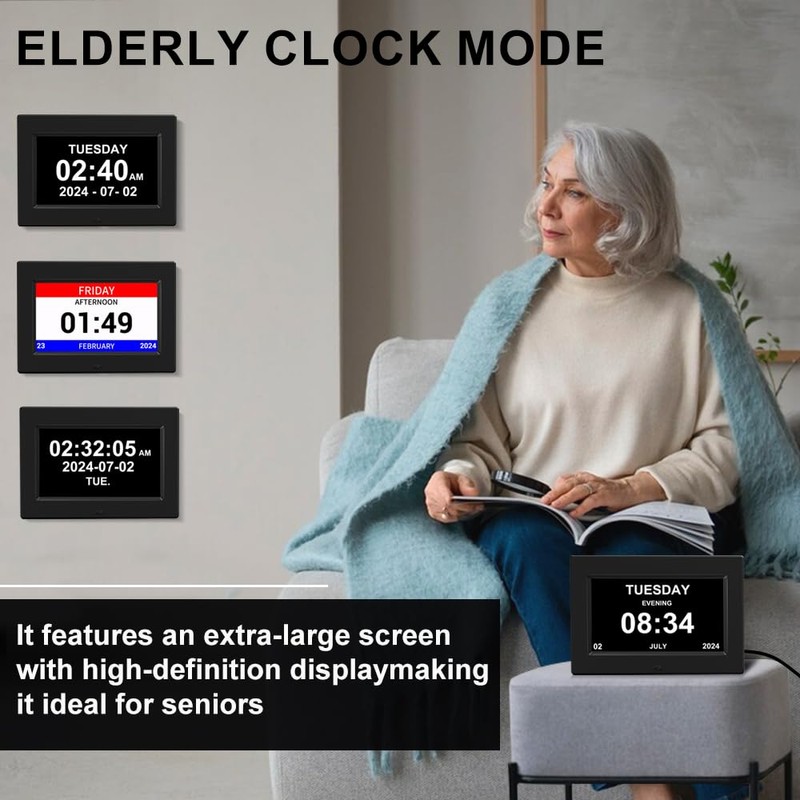 - 【Clock for the Elderly】: The clock features an IPS full-view HD screen with high contrast display. It shows the time, date, and day of the week in large, non-abbreviated fonts that are simple and easy to understand, making it very suitable for our elderly . It also has 8 built-in alarms with icons for activities like taking medication, exercising, and waking up. When an alarm turn on, the corresponding icon is displayed, reminding the user of the current activity. Additionally, it has a voice time announcement feature that announces the time every hour