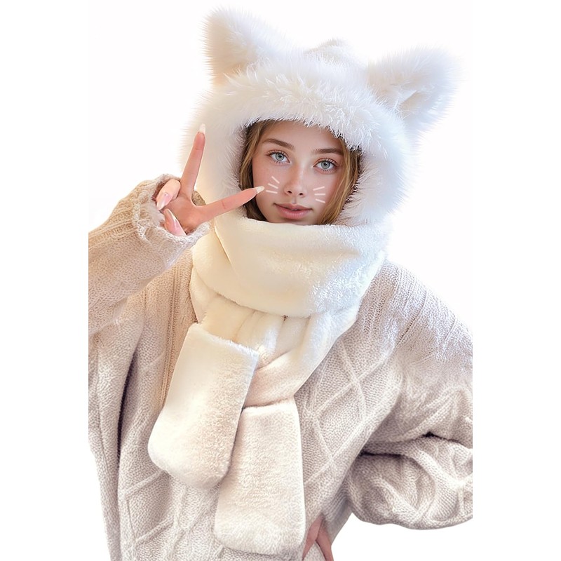 LATTEMARMALATTE Cute Cat Ears Winter Hat with Plush Scarf & Gloves, Girls' 3-in-1 Warm Set, Cozy and Windproof for Cold Weather Ivory